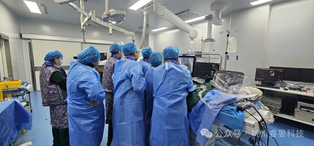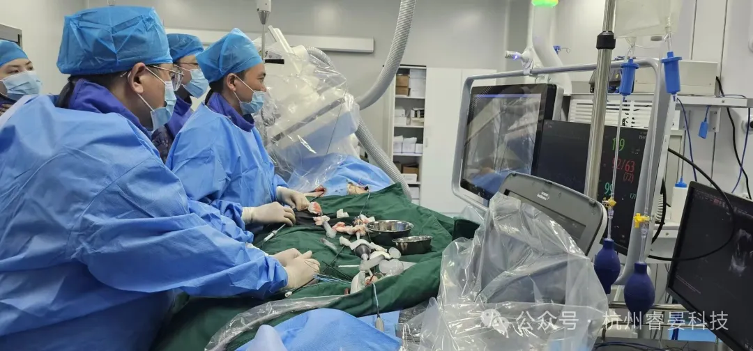 本次培训依托睿晏动物实验室专业级导管室进行。实验室配备了与临床完全一致的数字减影血管造影(DSA)C 型臂 X 射线系统、心腔内超声(ICE)实时引导系统、多道生理信号采集系统及先进的监护平台,为全流程操作训练提供了高度仿真的临床环境。