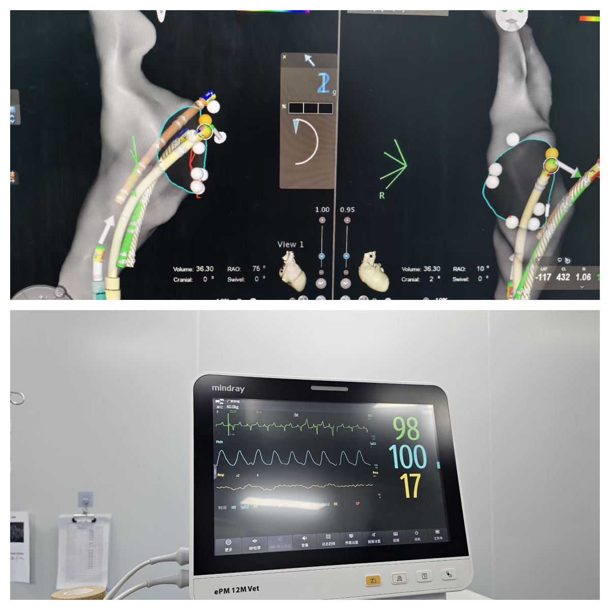 上午8点半开始,实验动物完成麻醉和消毒铺巾,正式进入实操环节。房间隔穿刺是首个挑战项目,新术者需要在DSA和ICE双重引导下,将可调弯鞘顺利抵达房间隔,在超声视角下呈典型“帐篷状“。部分学员首次操作时,因穿刺角度偏差导致鞘管在右心房反复打滑,经过老师提醒演示后,最终在不断尝试中成功顺利穿过房间隔。