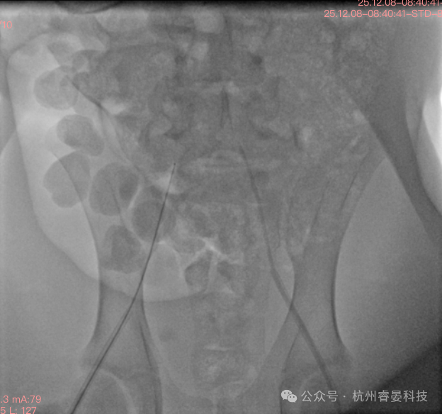 导管植入:穿刺动脉壁,将预充满肝素生理盐水的压力测定导管向心方向插入。根据测量长度,将导管前端送入髂总动脉位置。
